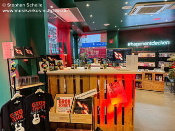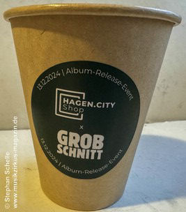 Lupo erzählte dann etwas aus der Bandgeschichte. 50 Jahre zuvor hatten Grobschnitt ihr Album „Ballermann“ herausgebracht. Zu dieser Zeit existierte Mitten in Hagen - nur einen Steinwurf vom heutigen Sitz des Hagen City Shops entfernt - ein Laden mit dem Namen „Die Schallplatte“. Der Besitzer hatte damals Grobschnitt angesprochen und gefragt, ob sie nicht Lust hätten die neue Platte in seinem Laden vorzustellen. Sie sollten aber in dem ca. 100 qm großen Ladenlokal auch live spielen. Es waren dann unglaublich viele Fans gekommen. Grobschnitt schleppten ihre Instrumente in den Laden und legten ordentlich los, was bei der Lautstärke sofort die Nachbarschaft aufbrachte, der dies zu laut war. Sie riefen dann die Polizei. Schon nach dem zweiten Stück standen sie auf der Matte. Das sorgte dann auf der Strasse erst mal für einen Verkehrsstillstand. Die Hagener Polizei forderte Grobschnitt sehr freundlich, aber auch sehr deutlich auf, leiser zu spielen, ansonsten würde die Veranstaltung abgebrochen. Wie man die Groben kennt, haben sie zunächst mal die Lautstärke runter gefahren, aber nach kurzer Zeit legten sie wieder in „normaler“ Lautstärke los, denn leise konnten sie einfach nicht. Nach zehn Minuten war die Polizei wieder da und sie mussten aufhören. Es war aber ein toller Promoerfolg für die Band und den Plattenladen. Und 2024 schloss sich nun der Kreis an fast gleicher Stelle.