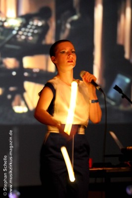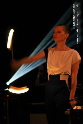 Aber auch etwas unterkühltere Klänge und Rhythmen hatten sie im Programm was sich im dritten Song „True“ zeigte. Als optisches Highlight schwang Christina dann bei „BAR Theme“ einen Leuchtstab, zu dessen Performance die Beleuchtung heruntergeschraubt wurde. Das sah wirklich klasse aus. Eines der letzten Stücke war dann recht instrumental und rhythmisch und zeigte dabei einige an Kraftwerk erinnernde Sounds. Eine gute Überleitung zum nächsten Act.