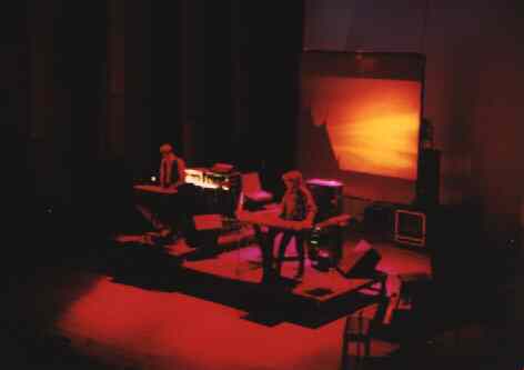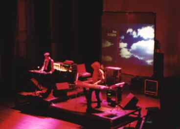 Bühnenshow von Diaprojektionen geprägt, die auf eine Leinwand hinter den Musikern