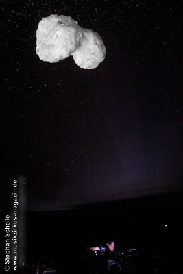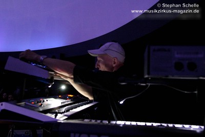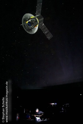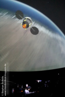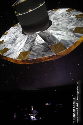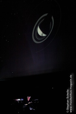 Im Stück „Mandarinentraum“ kamen natürlich einige Klänge und Melodiefolgen sowie Sequenzerparts zum Tragen, die man von Tangerine Dream her kennt, auf die bei diesem Titel angespielt werden soll. Auch das Stück „Outro“, das die Eigenkompositionen in seinem Set beschloss, stammt von „The Journey To Another Place“. Untermalt wurden Frank‘s Stücke durch große Animationen des Saturn, eines eisigen Meteoriten, der langsam über den Köpfen der Besucher dahinzog und durch Satelliten, die teilweise unseren Heimatplaneten umkreisten. Das sah majestätisch aus und passte perfekt zu seiner Musik.