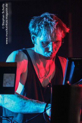 Er begann sein Set mit mysteriösen Klanggebilden und leichten Rhythmusmustern. Nach gut viereinhalb Minuten startete er dann einen pumpenden Beat und spielte dazu einige Harmonien. Er nutzte dazu kein Keyboard, sondern arbeitete an Drehreglern, Schaltern, Loopstation und Grafikpads. Dabei spielte er sich auch in einen Flow, der ihn aus dem Hier und Jetzt beamte und gab sich so ganz der Musik hin. Er wechselte beispielsweise Rhythmen, in dem er mit dem Finger auf ein Eingabegerät tippte und so rhythmische Elemente erzeugte, die geloopt und übereinandergeschichtet wurden. Das klang dann zwischendurch auch mal disharmonisch, was aber durchaus gewollt war. Es war unglaublich, wie er den Überblick über die Sounds und Rhythmen behielt und das Ganze auch noch so leicht und spielerisch aussehen ließ. Das zeigte, dass er bei dem Konzert ganz mit seiner Musik verschmolz.
