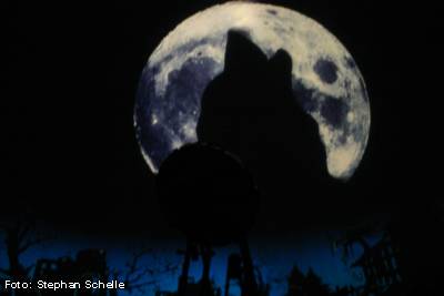 Wolfskopf vor einem Vollmond, Eislandschaften oder Spaceshuttle und