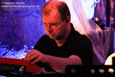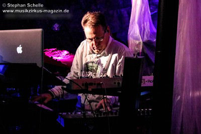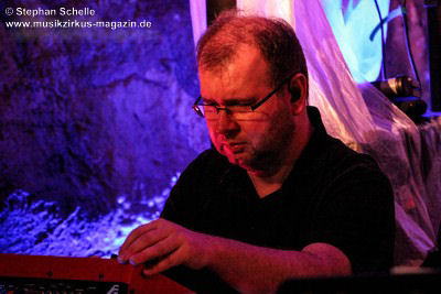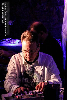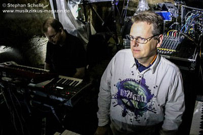Als letzter Act des Tages war dann das aus Leverkusen stammende Duo Pyramid Peak an der Reihe. Axel Stupplich und Andreas Morsch hatten für den Gig neues Material zusammengestellt. Die beiden boten besten Elektronikstoff. Da Axel und Andreas aber mit ihrem Instrumentarium auf dem Boden und nicht auf der Bühne platziert waren - aus Platzgründen war ein anderer Aufbau nicht möglich - konnte man die Beiden leider nicht von allen Plätzen aus sehen.