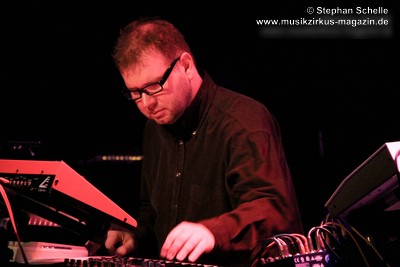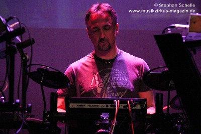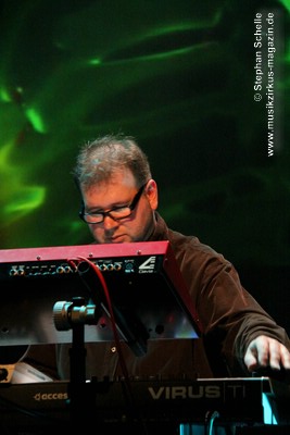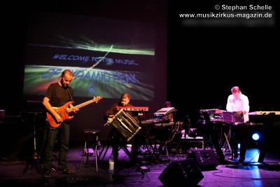 Und wieder ging es atmosphärisch und spacig weiter. Dieses mal mit dem neuen Stück „Stratosphere“. Dazu wurde ein Film von Testpiloten gezeigt, der schon etwas antiquiert zu sein schien bzw. auf alt getrimmt war. Schwebende Flächen trafen in diesem Stück auf pulsierende Sequenzer und leicht rockig angehauchte Gitarrenmotive. Dem folgte dann mit „Injection“ wieder ein Stück der aktuellen Pyramid Peak-CD „Anatomy“. Sehr schöne Farbspiele bestimmten auf der Leinwand und der Bühne das optische Bild.