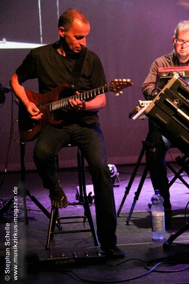 Mit „Dive“ vom Album „Ocean Drive“ hatten sie dann einen Klassiker (für mich eines der schönsten Stücke von Pyramid Peak) im Programm, der erstmals mit Gitarre live gespielt wurde. Der eingängige und mitreißende Track gewann durch Max‘ Gitarre um Einiges. Max ging dabei aber – wie beim gesamten Konzert – recht behutsam mit seinem Instrument um. Auch der Rhythmus, eine Kombination aus dem Rechner und dem Schlagzeugspiel von Uwe Denzer war knackiger als im Original gespielt. Dieses Mal waren im Hintergrund wunderbare Unterwasseraufnahmen zu sehen.