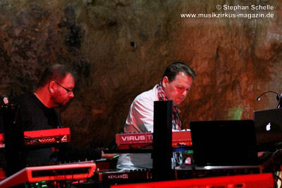 Die Klangfarben von Stück Drei waren eine Spur surreal. Es hörte sich jetzt so an, als wären wir unter Wasser angekommen und die Sonne spiegle sich auf der Wasseroberfläche, die man aus dem Untergrund betrachtet. Leicht verschrobene und düstere Sounds mischten sich dahinein. Axel und Andreas war aber alles andere als düster zu Mute, denn die hatten sichtlich Spaß an dem Auftritt und der Musik, denn ihr Gesichtsausdruck verriet große Spiellaune. Ein bisschen erinnerte mich dieser Track mit seinen mystischen Klangfarben an den Tangerine Dream-Soundtrack „Sorcerer“. Es dauerte gut sieben Minuten bis die beiden den Track in hellere Gefilde leiteten und teils sakral wirkende Klänge produzierten, was sehr gut in die Kanzelgrotte passte. Nach weiteren gut zwei Minuten kam dann ein Rhythmus auf und geleitete das Stück in den typischen Pyramid Peak-Kosmos. Dieser zweite Teil des Stückes war wesentlich rhythmischer und melodiöser und von einem stampfenden Beat unterlegt.