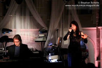 In ihrem gut 75minütigen Auftritt lag der Fokus mit ca. 50 Minuten auf dem Album "Prophecy", das den Untertitel "A Journey From The Ocean To The Stars" trägt. Gegen 19:30 Uhr starteten die beiden in ihr Set und lieferten atmosphärische Elektronik zwischen "Berliner Schule" im Stil von Klaus Schulze und den typischen britischen Sounds der Marke David Wright. Das Ganze würzten die beiden durch den Gesang Carys, die ihre Stimme hauptsächlich als Instrument einsetzte, denn sie sang im Wesentlichen keinen Text sondern eher Laute. Das kam mal folkig (leicht keltisch angehaucht), dann wieder arienhaft rüber. Zwischendurch sprach sie auch einige Texte.
