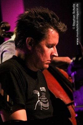 Weitere improvisierte Tracks folgten. Manchmal melodisch oder treibend, dann wieder verstörend und melancholisch wirkten die Stücke, übten aber eine ungemein faszinierende Stimmung im Publikum aus. Es ist bezeichnend für die fesselnde Musik des Trios, dass die Ränge im Publikum während des kompletten Konzertes, das nicht immer einfach zu konsumieren war, besetzt blieben. Aber wie sagte Frank Gerber am Ende des Festivals so treffend: „Diese Art von Musik muss die Szene aushalten können.“ Recht hat er, denn sie bereichert das Genre und zeigt darüber hinaus neue Wege auf.