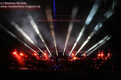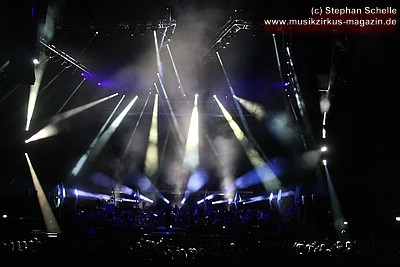 mit fächerförmigen Lasern, die sich aus dem Bühnenrückraum über die