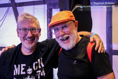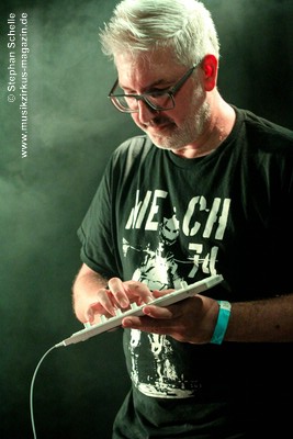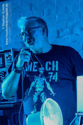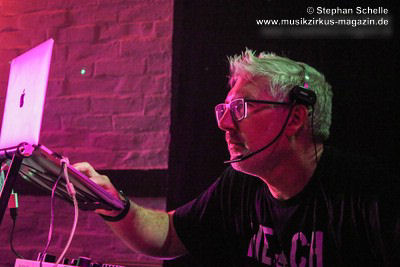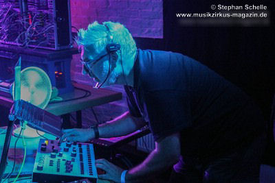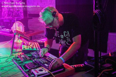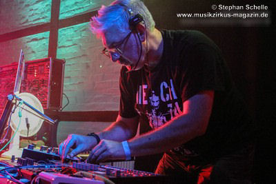 In Vorbereitung auf seinen Auftritt beim Electronic Circus hatte er dann seine Soundarchive durchforstet und stieß auf die Dateien für das China-Konzert. Die Programmierten Parts von „Niemand lacht rückwärts“ (Liveversionen sind auf den Alben „Sauce Hollandaise“ (1998) und „@shra“ (2002) erschienen) nutzte Steve um darauf zu improvisieren. Steve begann zunächst wieder recht spacig, das änderte sich aber nach gut einer Minute Dieser hypnotische Track mit seinen typischen Ashra-Sounds/Beats stellte dann auch den Höhepunkt seines Sets dar. Das sorgte dann für Begeisterung im Publikum, auch wenn Steve allein nicht den Druck und die Dynamik entfalten konnte, wie es die vierer Formation aus Göttsching, Grosskopf, Ulbrich und Baltes aufs Parket legten. Harald Grosskopf, der ebenfalls zur damaligen Ashra-Formation gehörte und bei diesem Konzert in der ersten Reihe saß, war ebenfalls sehr bewegt von diesem Track. Nach dem Konzert umarmten sich beide, die an diesem Abend 50% von Ashra ausmachten. Es war eine Reise in die Vergangenheit mit Sounds im Hier und Jetzt, denn Steve verstand es die Loops für sich zu vereinnahmen und daraus etwas grandioses Eigenes zu machen. Steves Soloauftritt war eine hypnotische Reise, die von Beginn an bis zum letzten Ton fesselte.