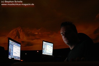 während des Auftritts hinter ihren Notebooks und einigen Tastaturen.