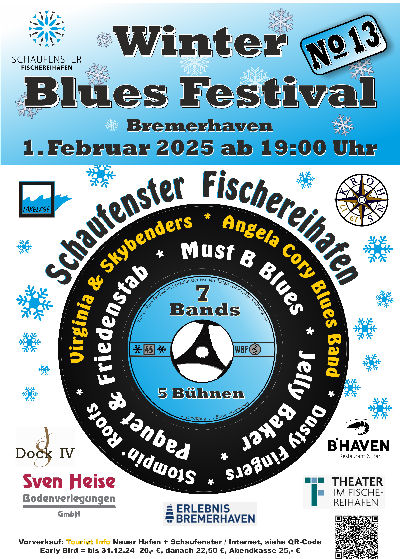 Den Fischereihafen an der Wesermündung verbindet man mit Seeleuten, Kuttern, Fischfang und Shanties, aber eben nicht mit Blues in allen Spielarten. Wir hatten trotz vieler Erklärungen und Beschreibungen des Kurators und Organisators Uwe Rademacher keine konkrete Vorstellung was uns erwartet, aber wer einmal dort war, wird überrascht sein über diese Kulisse, die man dort vorfindet. Besonders mitten im Winter an einem kühltrockenen, nebeligen Abend, der die Szenerie um das Museumsschiff und den zentralen Platz um die Club-Meile Packhalle IV noch ein wenig atmosphärischer machte. Wir fühlten uns an einen anderen Ort und eine andere Zeit im Mississippi-Delta versetzt. Aber nicht dort, sondern an der Weser fand nun zum inzwischen 13-mal das Winter-Blues-Festival statt, das 2-teilige Hauptprogramm dieser Traditionsveranstaltung im proppenvollen Theater im Fischereihafen (TiF) und fünf weiteren regionalen Blues-Bands in vier Clubs.