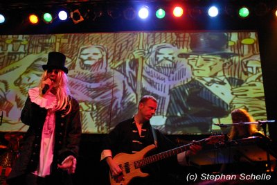 Eine kurze, humorvolle Einspielung auf der großen Bühnenleinwand läutete den Auftritt von Arena ein. Mit dem druckvollen Opener ihrer aktuellen CD „Pepper’s Ghost“, dem Stück „Bedlam Fayre“ starteten sie ihren Gig in Essen. Dazu waren schon einige der Comicbilder, die wir aus dem Booklet der CD kennen, zu sehen. In schwarzer Robe, Rüschenhemd, schwarzem Zylinder und blonder Perücke betrat Sänger Rob Sowden die Bühne und behielt dieses ungewöhnliche Outfit über weite Strecken des Konzertes an.