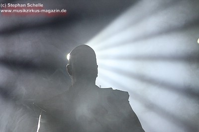 Ohne Vorband und großes Gezeter ging es pünktlich um 20.00 Uhr mit der Show los. Zu einem „Intro“, das elektronisch und rhythmisch, fast industrial klang, waren zunächst nur blaue, pulsierende Scheinwerfer zu sehen, die sich ihren Weg durch die Halle bahnten. Schon zu diesem Zeitpunkt war eine hohe Spannung im Saal zu spüren. Dann kamen die vier Bandmitglieder langsam auf die Bühne und zelebrierten mit „Kyrie“ eine Art Messe. Alexander wirkte dabei vor dem Schlagzeug kniend wie ein Hohepriester. Das war der Start zu einem mehr als zweistündigen druckvollen und mitreißenden Konzert.