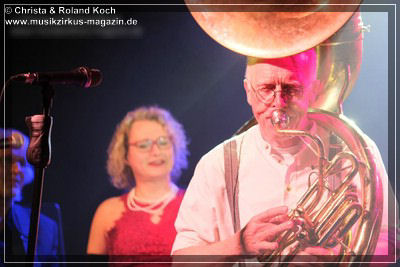 Auch beim Gesang wurden keinerlei Abstriche gemacht. Die beiden Hauptstimmen, weiblich Lydia Stone im signalroten Abendkleid (plus protzigen Perlenketten, schwarzer Federboa und edlen armlangen schwarzen Handschuhen) und männlich Norbert dazu stilecht im passenden Zweireiher und Al-Capone-Hut, werden ständig mehrstimmig aus dem Hintergrund kräftig und voluminös unterstützt. Es ist für ein abwechslungsreiches und vielfältiges Menü gesorgt und es ist ständig was los auf der proppenvollen Bühne.