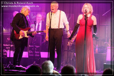Das Publikum im erfreulich gut gefüllten Saal wird von der ersten Minute an mit Blues-Krachern auf volle Betriebstemperatur gebracht und es wird eine Blues-Party, bei der es diesseits und jenseits der gedachten Mittellinie am Bühnenrand sehr körperbetont und dynamisch hergeht. Der gitarrenspielende Orchesterleiter Norbert Egger führt wie gewohnt mit kurzen Ansagen, gelegentlichen Handzeichen an das Ensemble, Fäden haltend souverän durch die mit einer kurzen Durchschnaufpause unterbrochene kurzweilige 2-teiligen Blues-Revue.
