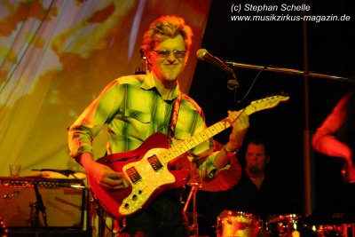 Das Jonas Reingold den Schalk im Nacken hat, das sieht man während eines Konzertes mehrfach. Irgendwie hat der Mann einen ganz coolen, trockenen Humor. In einer für ihn kurzen Pause - die anderen spielten bereits - nahm er nicht nur einen Schluck aus der Wasserflasche, sondern nutzte diese auch gleich als Instrument. Er blies mal eben so aus Langeweile, wie es schien, in den Flaschenhals. Da das in dem Moment ganz gut passte, machte er damit auch gleich weiter, was zur Erheiterung seiner Kollegen und des Publikums beitrug. In einer anderen Situation schlug er gemächlich auf die Saiten seines Basses ein, so wie man das von einem Affen – ist nicht bös gemeint, sah nur lustig aus – kennt, der ein unbekanntes Objekt untersucht. Das hatte auch was von einer kleinen Boxeinlage.