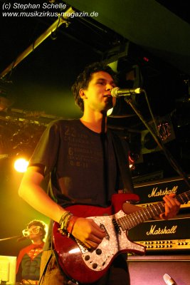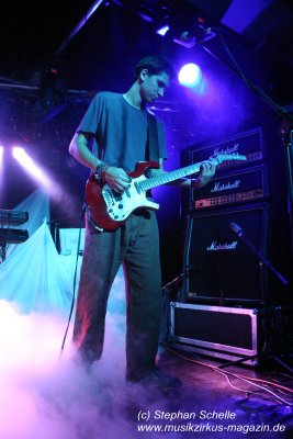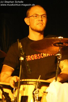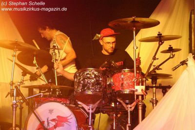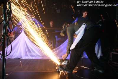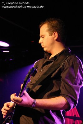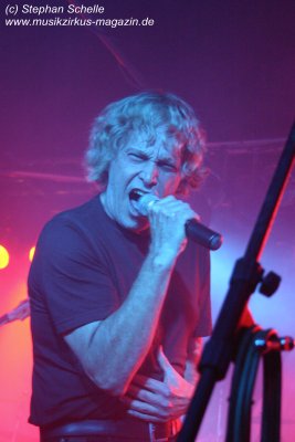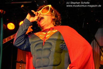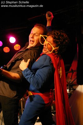 Die einzelnen Bandmitglieder betraten unter großem Jubel die Bühne. Toni Moff-Mollo hatte sich einen neuen Gags ausgedacht und so trat er gleich zu Beginn als „Super-Toni“ in einem Superman-Kostüm auf. War das Fankonzert am 18.05.2007 in Hagen-Hohenlimburg noch die Generalprobe, bei dem ich ebenfalls anwesend war, so stellte das Konzert in Aschaffenburg die Feuertaufe für die „alten“ und die „neuen“ dar. Entsprechend war ihnen zunächst die Anspannung anzumerken, die aber von der Euphorie des Publikums förmlich aus dem Saal geblasen wurde.
