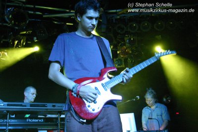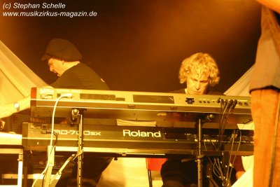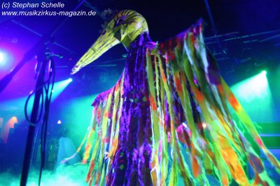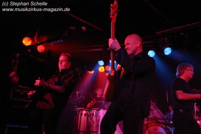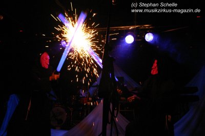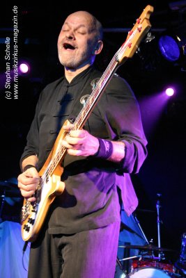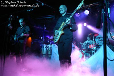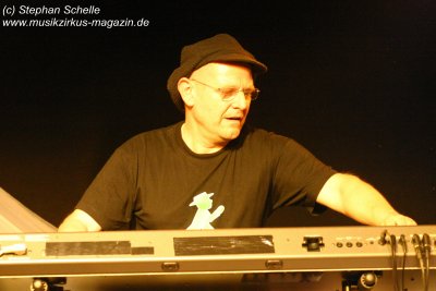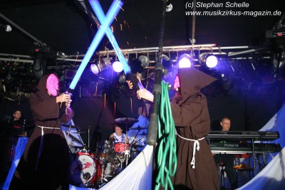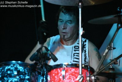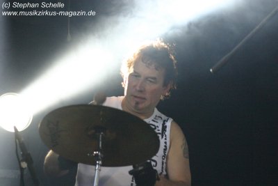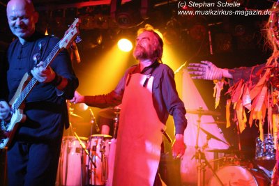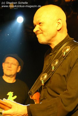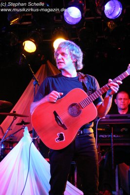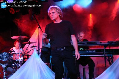 Hervorheben möchte ich aber an dieser Stelle „Könige der Welt“, welches sie in einer faszinierenden Version spielten. Zunächst sorgte Rolf Möller mit seinem Rhythmus der sehr stark an Peter Gabriel’s „Biko“ erinnerte für Gänsehaut, dann entwickelte sich das Stück durch Reggae-artige Passagen zu einem mitreißenden Song. Nie hab ich den Titel so gut gehört. Die neue Version war gegenüber der von Hohenlimburg durch den erheblich erweiterten Anfangspart verändert. Weitere Höhepunkte des Auftritts waren für mich die Versionen von „Ernies Reise“, „Anywhere“ und „Rockpommels Land Finale“ zu dem neben Trockeneis auch der Maraboo zum Einsatz kam sowie „Solar Music“ in der „Sonnentanz“-Version. Zwar mussten sie aufgrund der niedrigen Decke im Saal auf Pyrotechnik verzichten, hatten die Flex, den Sonnengott und Fackelträger trotzdem im Programm. Das sind halt die Elemente, die der Fan erwartet. Vor allem „Solar Music“ glänzte durch neue Passagen und herrliche Soli der einzelnen Musiker, die zu Szenenapplaus führten.