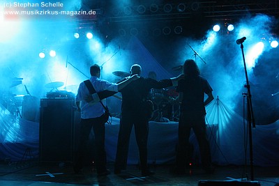 Auch die optische Unterstützung war wieder erste Sahne. Die Winkelschleifer sprühten, der Sonnengott mit seinen beiden Fackelträgern (sie hatten neue Masken und überarbeitete Kostüme) und der Schwertkampf fehlten natürlich auch nicht. Und mitten drin sprang Toni in einem Elefantenkostüm auf die Bühne und röhrte wie wild rum. Doch was dann, nach Beendigung des „Sonnentanzes“ kam, trieb so manchem Besucher die Freudentränen in die Augen. Deva Tattva fing an seinen Tasteninstrumenten an zu spielen und beschwor mit seinem Sound den Spirit der 70’er (ein Hauch von Volker „Mist“ Kahrs, der leider viel zu früh verstorbene Ex-Keyboarder, schien durch den Saal zu schweben), denn es folgte ein Part aus der 78’er Version von „Solar Music“, in der damals immer der Wikinger mit dem Feuerkreuz auf die Bühne kam. Der Rockpalast hat diese Version im Übrigen 1978 in Bild und Ton festgehalten (Liebe Freunde vom Rockpalast: "Wann kommt endlich die offizielle DVD?"). Das ist einfach Kult. Zu dieser Passage betrat dann Ralf Dreger als Wikinger mit dem Feuerkreuz die Bühne und ging langsam und vor Kummer gebeugt - so wie man es aus den 70'ern kennt - zur Bühnenmitte, um in einer Art Zeremonie das brennende Kreuz abzulegen. Wer dies aus den 70’ern kennt, der war sofort emotional berührt. Eine tolle Idee, diesen Showteil wiederzubeleben. Das war eindeutig der emotionale Höhepunkt des Abends.