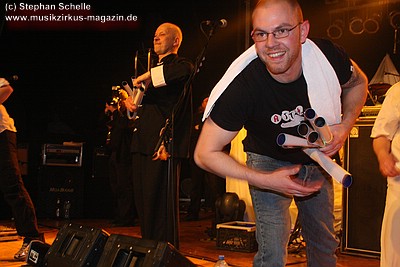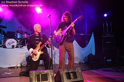 Während dem anschließenden „Merry Green“ machte sich in der Halle ein Geruch von Benzin breit. Hatte man sich vor Konzertbeginn noch über die vielen Feuerwehrmänner, die die Bühne inspizierten, lustig gemacht, kam jetzt ein etwas merkwürdiges Gefühl auf. „Sollte da etwas Ungewöhnliches passiert sein? Was ist, wenn die Jungs jetzt wieder einen pyrotechnischen Effekt zünden?“ dachte ich so bei mir. Doch dann war schnell klar, der Geruch hatte mit der nächsten Showeinlage zu tun, denn zum ersten Mal ließ sich Toni auf einem Motorroller (eine Hommage an seinen selbst gebastelten Shopper aus den 80’ern) zum Stück „Space Rider“ auf die Bühne fahren. Zu diesem Stück ließen sie dann auch noch Konfetti von der Decke regnen. Zu „Powerplay“ wurden dann alle vorgestellt, auch die Mädels und Jungs hinter der Bühne. Mit dem neuen Stück „Another Journey“, das seit dem 2008’er Auftritt in Betzdorf zum festen Programmteil gehört, und bei dem Axel „Felix“ Harlos (er wirkte neben Eroc als zweiter Schlagzeuger auf dem ersten Grobschnitt-Album mit) die Band an den Perkussion unterstützte, endete der dreieinhalbstündige Marathon mit kleinen Geschenken (Poster wurden ins Publikum geworfen) an die Fans.