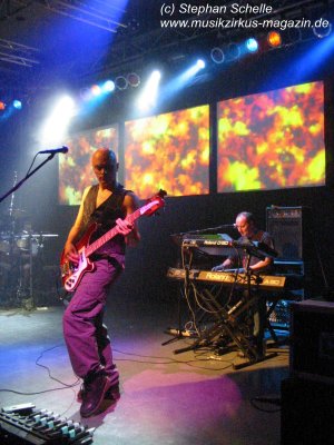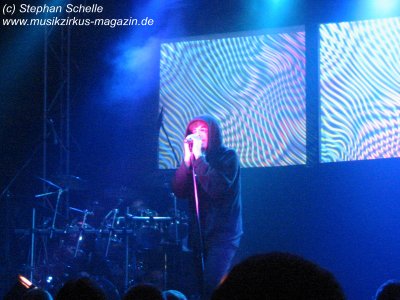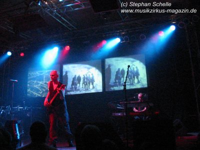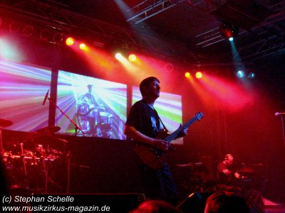 Dann ging es los. Aus den Boxen ertönte ein tiefer Bass und es wurden - zum Schrecken so manches Fans - Technorhythmen vernommen. Zu diesem fetten Sound erstrahlten die ersten Bilder auf den drei Projektionsleinwänden und zeigten ein IQ-Logo. Was ist denn jetzt los? dachte sich wohl so mancher. Aber das gehörte mit zu der guten Show. Die Musiker betraten die Bühne und von dem technoartigen Sound, der vom Band kam, ging es dann nahtlos in die Livemusik der bekannten IQ-Stücke über.