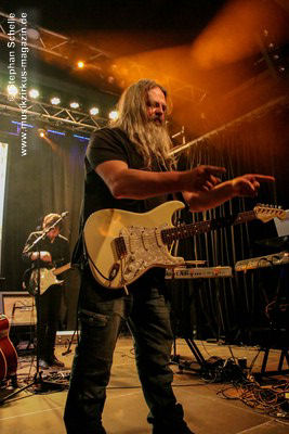 Gesangseinsatz ans Mikro trat, auf die Bühne. Dann startete die Band in