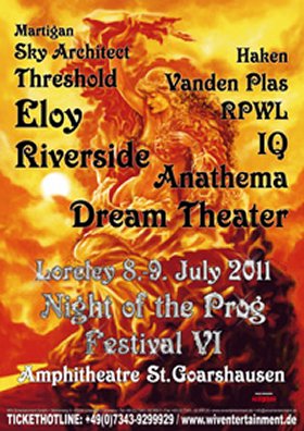 Es spielten am Freitag, den 08.07.2011: Martigan (Deutschland) Sky Architect (Niederlande) Threshold (Großbritannien) Riverside (Polen) Eloy (Deutschland) Am Samstag, den 09.07.2011 traten auf: Haken (Großbritannien) Vanden Plas (Deutschland) RPWL (Deutschland) IQ (Großbritannien) Dream Theater (USA) Anathema (Großbritannien) |