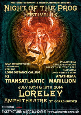 Es spielten am Freitag, den 18.07.2014: Gran Turismo Veloce (Italien) Traumhaus (Deutschland) Collage (Polen) Long Distance Calling (Deutschland) I Q (Großbritannien) Transatlantic (USA / Großbritannien / Schweden) Am Samstag, den 19.07.2014 traten auf: Synaesthesia (Großbritannien) A Liquid Landscape (Niederlande) Dream The Electric Sleep (USA) Clepsydra (Schweiz) Brian Cummings (Großbritannien) Anathema (Großbritannien) Marillion (Großbritannien) |