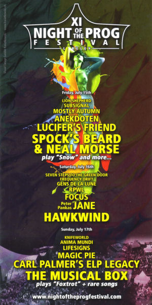 Die Einzelberichte findet ihr unter den u. a. Links der Bands. Es spielten am Freitag, den 15.07.2016: Lion Shepherd (Polen) Subsignal (Deutschland) Mostly Autumn (Großbritannien) Anekdoten (Schweden) Lucifer's Friend (Deutschland) Spock's Beard playing "Snow" (USA) Es traten am Samstag, den 16.07.2016 auf: Seven Steps To The Green Door (Deutschland) Frequency Drift (Deutschland) Gens De La Lune (Frankreich) R P W L (Deutschland) Focus (Niederland) Peter Panka's Jane (Deutschland) Hawkwind (Großbritannien) Und am Sonntag, den 17.07.2016 waren zu sehen und zu hören: Knifeworld (Großbritannien) Anima Mundi (Kuba) Lifesigns (Großbritannien) Magic Pie (Norwegen) Carl Palmer's ELP Legacy (Großbritannien) The Musical Box plays "Foxtrott" (Kanada) |