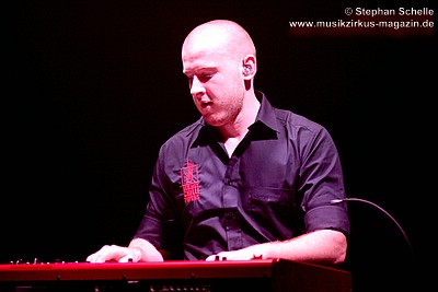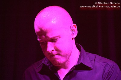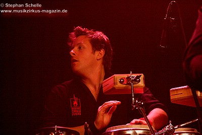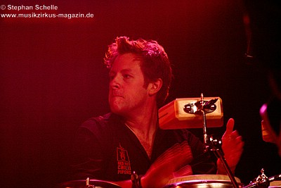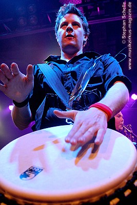 Mit dem Stück „Little Cascade“ kam dann auch noch eine Spur Worldmusic mit in das Set, denn der Rhythmus hatte schon etwas orientalisches und verlieh dem Ganzen eine hypnotische Note. Wer sich jetzt immer noch nicht von der Band angesprochen fühlte, der muss wohl taub gewesen sein. Apropos Rhythmus: Die Rhythmusgruppe aus Schlagzeuger und Perkussionist gefiel mir ausgesprochen gut, denn sie sorgten für einen fetten Sound, wenn sie zusammen agierten. Im ersten Teil kam Paul Jennings mit einem Cajun an den Bühnenrand, auf dem er einen unglaublich fetten Rhythmus hinzauberte.