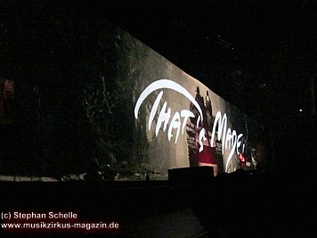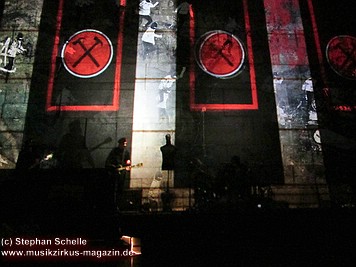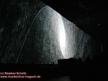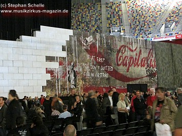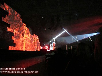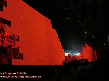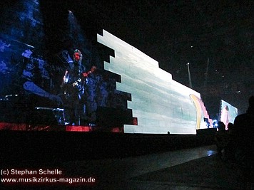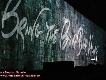 Der Großteil der Bühne war bereits durch die Mauersteine bedeckt. Nur in der Mitte war noch ein Keilförmiger Spalt geöffnet, durch den man die Band bei den ersten Stücken agieren sehen konnte. Darüber war die von Pink Floyd bekannte runde Leinwand angebracht.