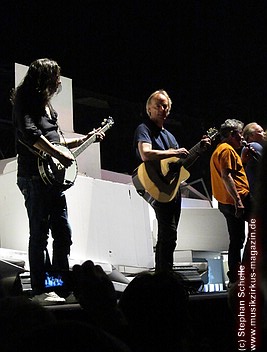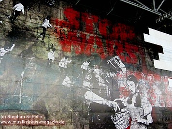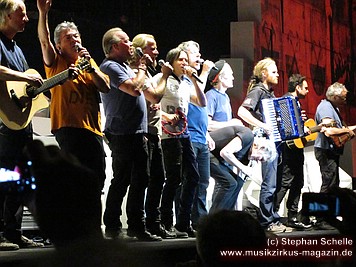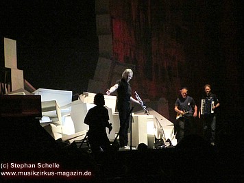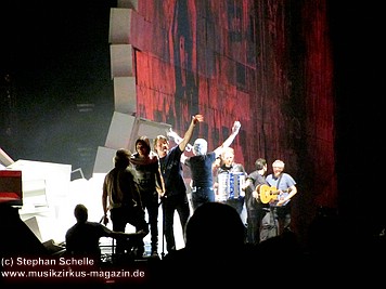 Es folgte mit „Run Like Hell“, der rockigste Song des Albums. Und nach „The Trial“ wurde dann die Mauer, mit einem wuchtigen Sound untermalt, eingerissen. Wow, welche Dramatik. Den letzten Song „Outside The Wall“ präsentierte die komplette Band mit Akustikinstrumenten (darunter Trompete, Ukulele, Akustikgitarre, Banjo, Perkussion) direkt vor dem „Schutthaufen“ der eingestürzten Mauer.