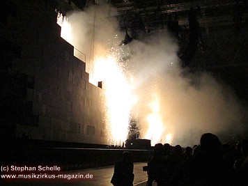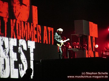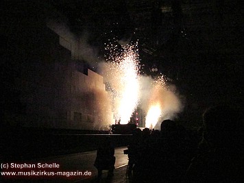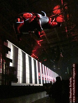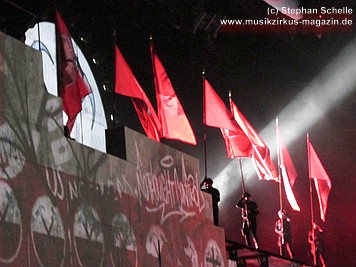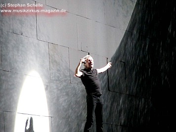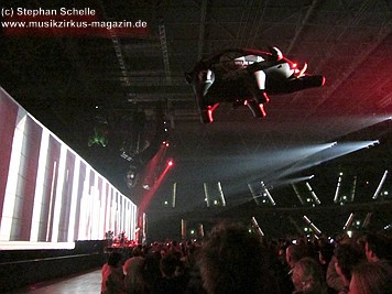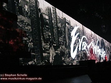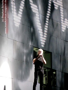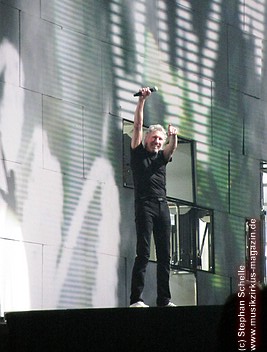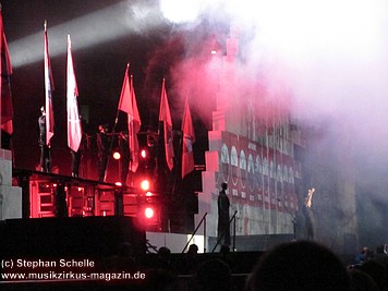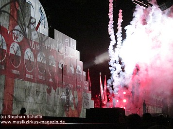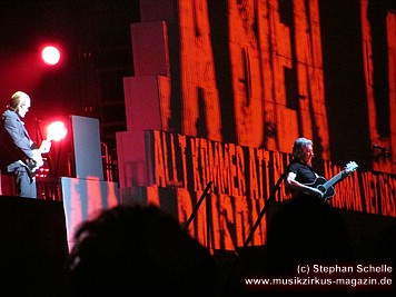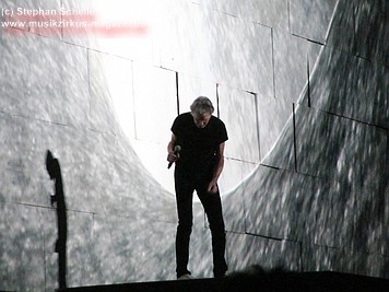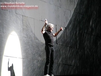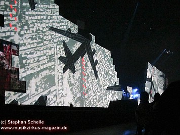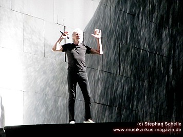 Uniformierte Personen, darunter natürlich Roger Waters, betraten zu Beginn (die Militärs hatten die Puppe dabei) die Bühne und los ging eine gut zweistündige Show, die keine Wünsche übrig ließ. Fahnenschwenkende Statisten, Funkenregen und Feuerwerksraketen, die an die Hallendecke schossen und dann mit einem echt klingenden Absturzgeräusch rauschte die Stuka in die Mauer. So furios begann das Spektakel in der Esprit-Arena von Düsseldorf.