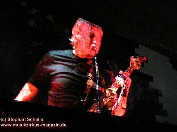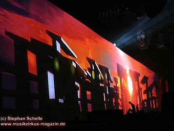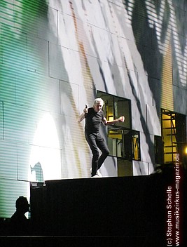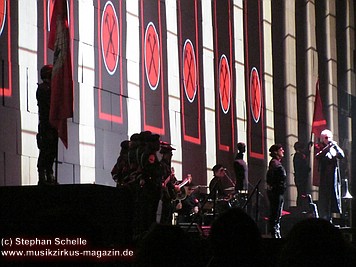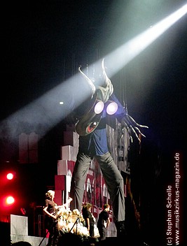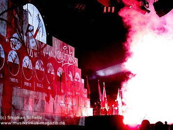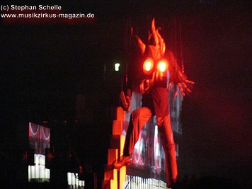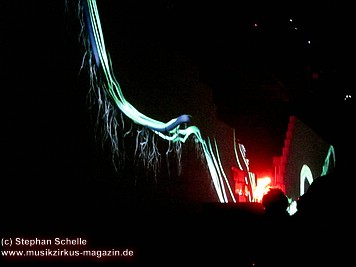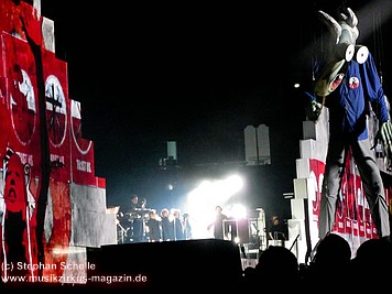 Beim Song „Goodbye Blue Sky“ verdunkelte sich die Mauer und Bomber kamen angeflogen. Aus den Ladeklappen fielen dann sehr schön animierte Zeichen für den Kapitalismus wie zum Beispiel ein Mercedes-Stern, eine Shell-Muschel, Doller- und Euro-Zeichen (sie kamen in roter Farbe auf dem grauen Hintergrund sehr gut zur Geltung). Und so stieg dieses Rot wie Blut an und nahm die ganze Fläche ein. Und zu „Don’t Leave Me Now“ stand plötzlich die überdimensionale Ehefrau (ganz in grün) mit ihren leuchtenden Augen und Lippen vor der Bühne. Das war schon ein imposantes Bild. Zumal die Farbspiele auf der Mauer so gut animiert waren, das man sie nicht als Projektionen wahrnahm. Es wirkte förmlich so, als flössen Farbstreifen die Wand herunter.