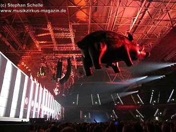 Zu „In The Flesh 2“ schwebte dann ein großer Ballon in Form eines Schweines (es wurde ferngesteuert und konnte sich somit frei in der Halle bewegen) über die Köpfe der Zuschauer. Wieder so ein beeindruckender Teil der Show. Dann kamen die uniformierten wieder auf die Bühne und auch die Band platzierte sich zum Ende hin vor die Mauer (Instrumente inkl. Schlagzeug wurden aufgebaut). Roger zog sich die Uniform an, in der er bedrohlich wirkte und schoss mit einer Maschinenpistolenattrappe ins Publikum (Das gehört zum Thema des Albums und spiegelt nicht den Charakter von Roger Waters wider, ganz im Gegenteil). Hier demonstrierte Roger Waters wieder das hässliche Gesicht der Macht.