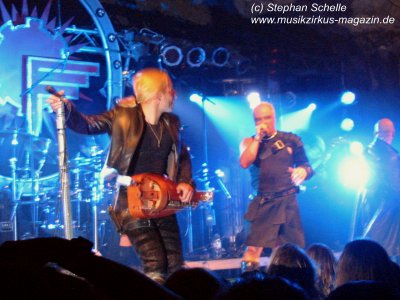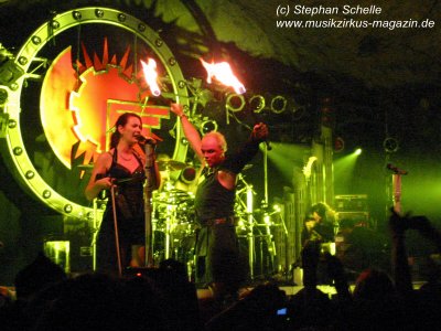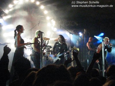 | Den heißesten Auftritt des Abends hatten zweifelsohne Subway To Sally. Und das ist im wahrsten Sinne des Wortes zu verstehen, denn die sieben Potsdamer legten eine Show hin, die mit pyrotechnischen Einlagen nur so gespickt war. Neben Songs der aktuellen Scheibe waren auch ältere Stücke im Programm. So durfte natürlich der Veitstanz nicht fehlen, zu dem die brodelnde Menge wild tanzte. Auch die Henkersbraut, Mephisto, Die Schlacht, Sag dem Teufel und Kleid aus Rosen standen auf dem Programm.