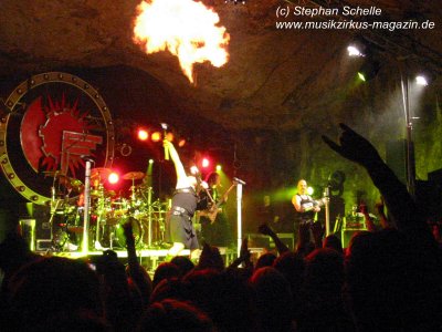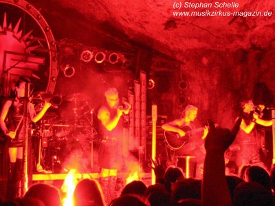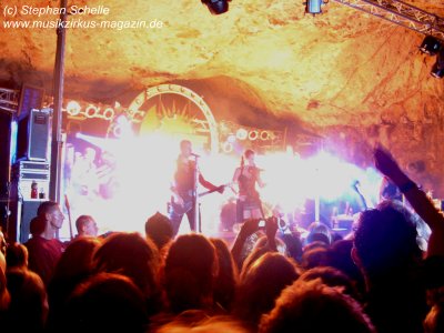 Neben einer sehr ausgereiften Lightshow waren vor allem die Feuerspielereien ein absoluter Hingucker. Ob nun gleich zu Beginn Feuerfontänen am Rand der Bühne für einen Knalleffekt sorgten oder aber bei Die Schlacht aus der Feuerorgel im Hintergrund die Funken sprühten, alles passte perfekt zu diesem durchgestylten Auftritt. Dann wurde Feuer gespuckt und der krönende Höhepunkt kam als sich Bodenski und Simon mit Flammenwerfern bewaffneten. Mit diesen schossen die beiden Feuerfontänen über die Köpfe der Zuschauer. Da wurde es in den vorderen Reihen ganz schön warm. Die Musik von Subway To Sally war im Vergleich zu den bisher aufgetretenen Bands rauer, härter und brachialer. Die hauten da Sachen raus, dass ich hoffte, meine wenigen, noch festgewachsenen Haare nicht zu verlieren. Die Band brachte die Höhle dermaßen zum beben, dass man glaubte, die wollten mit der Musik und der Pyrotechnik einen weiteren Gang in den Stein sprengen.