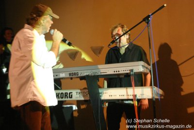 Richtig ab ging es dann aber mit dem folgenden „In meinem Kaff“, da knallten sie einen ordentlichen Sound raus, das so manchem Einwohner den Hut vom Kopf haute. Die acht auf der Bühne machten einen sehr guten Eindruck, was sich vor allem durch ihre Spielfreude zeigte. Besonders hervorheben muss man, dass Reiner Hänsch gesundheitlich nicht ganz auf der Höhe war, was man ihm aber überhaupt nicht anmerkte. In ihrem Programm brannten sie dann ein Feuerwerk aus ganz alten Stücken, Werken aus der letzten Vergangenheit (aus den Alben seit ihrem Comeback) sowie brandneuen Titeln ab. Es zeigte sich, dass so mancher den Text des ein oder anderen Liedes noch drauf hatte, denn es wurde fleißig mitgesungen.