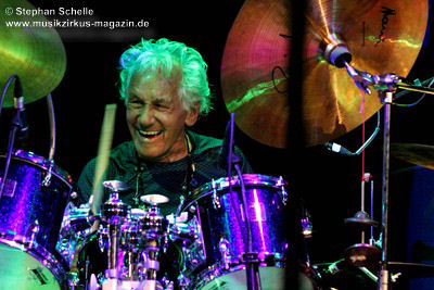 durchgängig Bühnen-Akrobat und Orchesterleiter Mani Neumeier.