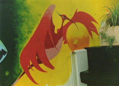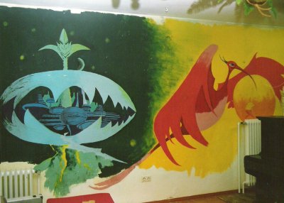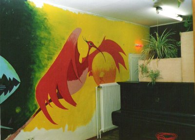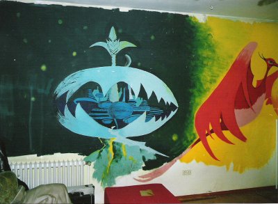 Das Bild ist irgendwann in den ganz späten 1970ern von einem Freund (Klaus Hebing aus Bocholt) auf die Wand meines Zimmers in Rhede (Westfalen) gemalt worden. Irgendwann Ende der 1980er ist das Gemälde dann - im Rahmen einer Sinn- und Lebenskrise, die einen "Tapetenwechsel" dringend erforderlich machte - weiß übermalt worden. Schade eigentlich, aber da ich jetzt ohnehin nicht mehr dort sondern in Leipzig lebe, hätte ich eh' nicht viel davon - und mitnehmen kann ich es ja leider auch nicht. Hätte ich es damals bloß nicht auf die Wand, sondern auf ein großes Tuch malen lassen! Naja, vielleicht stoßen ja irgendwann in tausenden von Jahren mal irgendwelche Archäologen darauf, wenn sie die Ruinen einer längst vergessenen Siedlung in einem - der Sage nach - früher mal Westmünsterland genannten Landstrich erforschen.