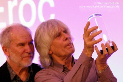 Der Höhepunkt des Abends war dann die Verleihung des Ehrenpreises für sein Lebenswerk an Eroc. Sie begann kurz vor Mitternacht und wurde von Winfrid Trenkler als Laudator umfangreich gewürdigt. Das es gerade die Radiolegende Winfrid Trenkler war, der die Laudatio für Eroc vornahm und dafür extra aus seiner Heimat Nordschwedens (Lappland) angereist war, ist kein Wunder, verbindet die Beiden doch seit den 70’er Jahren eine große Freundschaft.