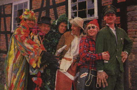 in der garderobe wird die bühnengarderobe von der garderobiere auf die einzelnen garderoben verteilt. die gitarristen örgeln neue saiten auf die geigen. milla traktiert seinen bass mit einem schraubenzieher. das stimmgerät quakt. direktor ballermann baltert durch die räume, fragt wer was, wann, wo, essen will. die örtliche presse steht vor der tür und wird vertröstet. jemand brüllt durch den flur: ,,wildschwein, soundcheck!" mit einer bierflasche und 2 gitarren bewaffnet wackelt willi auf die bühne. zuerst das mikro. "eins, zwo, drei. drei, zwo, eins!" nach dem 20. mal ist franz unten in der halle zufrieden. die gitarren werden angespielt, echo und halleffekte ausprobiert. franz strahlt: ,,der nächste bitte!" nach dem einzelsoundcheck, soundcheck für alle. 2 stücke werden gespielt. lupo hat probleme mit seiner gitarre. udo, der mann am bühnenmixer, wird geweckt. ,,leg ma'meine gitarre auf'n monitor. ich hör nix!" udo, noch etwas benommen, findet nach einiger zeit die richtigen knöpfe. lupe ist zufrieden, vorhang zu, die leute können rein. die halle füllt sich. auf der bühne werden die gitarren zum letzten mal nachgestimmt. erce gibt franz über funk zeichen, das band mit dem vorprogramm zu starten. willi legt sich hinter seinem verstärker einen kleinen biervorrat an. es wird ein langer, heißer abend. |