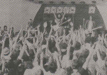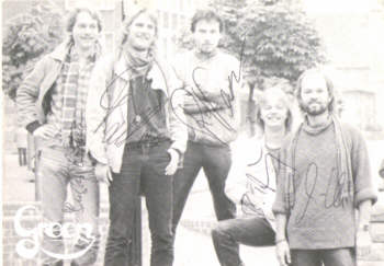 An der ersten LP wird zur Zeit gearbeitet. Sie soll demnächst veröffentlicht werden. Bis dahin verschaffen Demo-Bänder einen guten Eindruck von dem, was GREEN zu bieten hat. Übrigens, für Veranstalter: GREEN verfügt über ein professionelles P.A. und eine eigene Lichtanlage, so daß bei Auftritten Optik und Akustik stimmen. Musikertreff 9/79 GREEN heizt ein GREEN bewährte sich wieder einmal als Garant für eine Wahnsinnsfetenstimmung. Gegen Ende gerieten die Fans total aus dem Häuschen. Bei "Smoke on the water" gings so richtig los. Wer noch sitzenbleiben wollte, mußte aufpassen, nicht von den rockenden Oldie-Fans zertrampelt zu werden. Die Leute ertobten sich noch mehrere Zugaben. Und wer bei "Satisfaction" noch ruhig sitzen oder stehen blieb, ist ganz bestimmt ein hoffnungsloser Fall ... Fazit: GREEN schafft es (ganz besonders durch die Persönlichkeit Millas und den fetzigen Bubi Hönig) das Publikum unmittelbar anzusprechen und ein absolutes Oldie-feeling zu vermitteln, - übrigens auch mit ihren selbstgeschriebenen Stücken, - und für den Spaß wird GREEN von seinem Publikum geliebt. Musiker 6/79 Im Gebiet Wuppertal/Hagen scheint sich eine der interessantesten und produktivsten Szenen in Deutschland zu entwickeln. Denken wir an Hölderlin, Grobschnitt, Ramblers, Cataract und Plastique. Ebenfalls aus dieser Gegend kommt auch die Gruppe GREEN, die das Zeug zu haben scheint, in dieser Reihe bald mit aufgeführt zu werden. Wir trafen sie beim letzten Dortmunder Uni-Fest, wo sie vor über 2.000 Leuten bis drei Uhr nachts spielten und höllisch einen losmachten. Anschließend unterhielten wir uns in lockerer Atmosphäre mit der Band. Musikertreff 1980 Hallo, GREEN kommt! Das war das, worauf die Hohenlimburger schon seit längerem gewartet hatten. Nun ja, sie waren auch zahlreich erschienen. Man munkelt so um die 350 Personen. Und das im Mini-Jugendheim! Die Stimmung war schon vor dem Konzert sehr erwartungsvoll. GREEN jetzt mit neuem Tastenmann erfüllte natürlich die Erwartungen der Jugendlichen voll. Die Fans dankten es den Musikern auch; der Saal erinnerte an die ersten 10 Reihen beim Udo Lindenberg-Konzert. So etwas hatte man lange nicht mehr in Hohenlimburg gesehen! Der Verfolgerspot der neuen, wirklich toften Lichtanlage sorgte durch übermäßige Saftabnahme aus dem Stromnetz des Jugendheims für kleine Unterbrechungen, die von Fox mit kernigen Drumsoli überbrückt wurden. Trotz dieser kleinen Unterbrechungen konnte GREEN wieder einmal voll überzeugen. Auch der neue Tastenmann Dirk Lindemann (Ex Fasten Seat Belts) integrierte sich sehr gut bei der sonst unveränderten Gruppe. Neben neuen Liedern, die demnächst (genauer Termin steht noch nicht fest) auf einer LP zu hören sind, spielten GREEN die guten alten Songs, auf die die Discoverwöhnten Jugendlichen voll abfuhren. Nach zwei Zugaben, die mit Jumpin Jack Flash und Satisfaction die Hörer (und Dancer) total zum Ausflippen brachten, konnte GREEN, die am Vorabend in Gießen noch bis zwei Uhr morgens gespielt hatten, wirklich nicht mehr! Ende, nichts geht mehr ... |