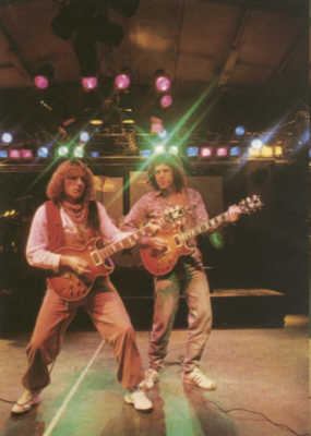LUPO: Auf der Bühne haben wir bisher wenig Probleme gehabt, weil wir ausschließlich Ovation gespielt haben, um sämtlichen Problemen aus den Weg zu gehen, es ist das einfachste; Kabel rein und in die PA rein. Wie wir es dieses Jahr machen, ist noch nicht ganz klar. FACHBLATT: Über welchen Amp spielst du ? LUPO: Ich spiele Music Man Amp HD 130. Das ist so ein kleiner Schrank und der ist Spitze, Wildschwein spielt den gleichen. FACHBLATT: Sonst nichts....mit Effekten und so? LUPO: An Effektgeräten habe ich Wah Wah, dann spiele ich seit Jahren schon so'n ganz altes Modell von Electro Harmonix, das Electric Mistres so'n kleiner grüner Apparat, da kommen dann so urige Soundmöglichkeiten raus. Wir spielen noch das Roland Chorusgerät. FACHBLATT: Was spielt der Milla? MILLA: Ich spiele schon seit vielen Jahren den Rickenbacker-Bass 4001 Stereo und wie viele Leute, die einmal Rickenbacker spielen, komme ich nicht mehr davon runter. Ich habe schon viel ausprobiert und komme mit keinem anderen Bass richtig zurecht, das ist bei Rickenbacker also ziemlich einzigartig. FACHBLATT: Kein Problem mit der tiefen E-Saite ? MILLA: Nein, damit habe ich keine Probleme. Ich habe eine Ampeg-Anlage SUT mit zwei Boxen. Eine mit den 8 kleinen Speakern und eine V 4 mit zwei 15" Speakern. Ich nehme Rotosound-Saiten, die ungeschliffenen. Ich habe auch ein paar Effektgeräte, was beim Bass natürlich immer ziemlich problematisch ist, weil die sehr leicht die Bässe wegnehmen. Ich spiele den lbanez-Phaser Phasetone 2 und den halte ich gerade für den Bass für sehr gut, weil er wenig Frequenzen beschneidet. Dann spiele ich zusätzlich auf der Platte über ein Echogerät, das MXR Analog Delay, den Boss-Chorus und noch von MXR den Envelope Filter. Ich bin sehr zufrieden mit den Sachen, da sie den Sound noch sehr gut rüberkommen lassen. Ich habe jetzt noch das Moog Tauruspedal. Ich setze das Pedal aber nur dann ein, wenn ich mal richtig Druck brauche, wenn ein tiefer Ton stehen soll. Ich spiele also keine Melodien auf dem Taurus, nur Einzeltöne. FACHBLATT: Habt ihr irgendwelche speziellen Tricks ? LUPO: Ernie Ball spielen wir, muß ich noch dazu sagen. Wildschwein und ich, 0010. Super Slinky. FACHBLATT: Bevorzugst du irgendwelche Tonleitern ? LUPO: Nicht gerne, schöne Solomelodien spiele ich gerne, also nicht so schnelles Wirrwarrzeug, was heute mittlerweile sehr viele spielen, wahrscheinlich schon zu viele. Lieber noch aus der alten Schule, friiher hieß das ja auch nicht Sologitarrist, sondern Melodiegitarrist. FACHBLATT: Denkst du dir das aus vorher oder spielst du einfach so ? LUPO: Ne, ich spiele oft so und dann wird das zu Hause noch mal überarbeitet. Heute sind ja viele Klopper unterwegs, also E-Dur ist ja überhaupt der Spitzen-akkord und der bringt es über alle Saiten. Das ist ja ab und zu mal ganz gut, aber wenn die E-Saite dann meistens noch verstimmt ist ..... FACHBLATT: Ich habe immer mal das Gefühl, daß von Mal zu Mal die Solos immer ähnlicher werden. LUPO: Das liegt wohl an der Musikrichtung. Alles, was im Moment draußen ist, und den Anschein hat, populär zu sein oder sein zu wollen, ist eben "New Wave" und irgendwie hauen die alle E-Dur rein und machen nur Druck und man hört nirgendwo, daß es mal ein bißchen ruhig wird, daß die Musik offen wird, daß sich irgendwas öffnet, daß irgendwas mal stehenbleibt, daß ein Akkord einfach im Raum mal stehenbleibt. Es kann ja ruhig, rhythmisch laufen, aber man hört immer nur bum, bum, bum, bum , die klotzen einfach nur noch rein und dann muß auch immer schnell dazu gespielt werden. Wenn einer 32tel spielt, dann spielt der Sologitarrist noch 64te1 darüber, wenn er es gerade noch so hinkriegt. FACHBLATT: Du bist also der Meinung, der Song, die Melodie ist wichtiger als alles andere ? LUPO: Wesentlich wichtiger. FACHBLATT: Übst du viel? LUPO: Nicht mehr so viel, wie ich es früher mal getan habe, weil ich wenig Zeit habe. Wir haben jetzt laufend Proben gehabt, wir haben das ganze Jahr an der LP gearbeitet und da brauchte ich es im Prinzip nicht. Das einzige, was ich geübt habe, ist, wenn ich mir etwas für die Plattenproduktion ausdenken mußte, wo ich da noch mal ein bißchen feilen wollte. Ich möchte auch noch was zu unserem Equipment sagen, da wir bisher nur das von Wildschwein und mir besprochen haben. Der Schlagzeuger spielt ein Pearl-Set mit Paiste-Becken, unser Organist spielt Fender-Rhodes, Minimoog, Polymoog, MeIlotron 400 mit Band Spezialanfertigung, einen Prophet Synthesizer, den neuen, übrigens ein sehr guter Synthesizer, obwohl Schulze irgendwo mal geschrieben hat, der wäre gar nicht so gut. Dann hat er seine berühmte Dr. Böhm-Orgel, diese selbstgebaute, die hat er immer noch, sein Hohner Clavinet natürlich und eine Armon-Orgel. Er hat ein eigenes Dynacord-Mischpult. An Effektgeräten hat er die von Boss, dann noch den lbanez-Flanger, ein Leslie hat er auch noch. Die P.A.Boxen sind Marke Eigenkonstruktion, die Mikrofone sind von AKG. FACHBLATT: Sag doch mal was zu eurer "Firmenpolitik"! LUPO: Für uns ist es eben gut, daß wir höchst selten die Leute mal ausgewechselt haben, in den letzten Jahren haben wir überhaupt nur zweimal Mitglieder ausgewechselt, jedesmal sind es die Bassisten gewesen, was natürlich nicht heißen soll, daß die Bassisten schlecht waren. Ich halte es für unheimlich wichtig, wenn die Gruppen endlich wieder lernen würden, lange zusammenzuspielen, weil es doch extrem viel ausmacht. Die deutschen Gruppen, die heute noch an der sogenannten Spitze sind, so Gruppen wie Novalis, Scorpions, Grobschnitt, diese Gruppen sind alles Gruppen, die im Prinzip schon seit 10 Jahren spielen. Wie gesagt, alle die Gruppen müssen sich einfach abschminken, daß, wenn sie sich irgendwann mal eine Anlage kaufen, und drei Akkorde spielen können, die großen Superstars zu sein. Bei uns mußt du dich richtig hochdienen. Es gab bisher ganz wenig Ausnahmen, Nina Hagen, Marius Müller-Westernhagen waren ne Ausnahme. FACHBLATT: 