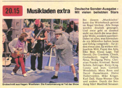 Musikladen extra Deutsche Sonder-Ausgabe Mit vielen beliebten Stars Bei diesem "Musikladen" kann das Wörterbuch getrost im Regal bleiben: Alle Songs werden deutsch gesungen. Und zwar geht es diesmal nicht nur durch die neue deutsche Welle, sondern querbeet: Dabei ist alles, was hierzulande ein Mikrofon halten kann und Erfolg verspricht für jeden etwas also. Es wirken mit: Joachim Witt, Foyer des Arts, Elke Best, Klaus Lage, Ted Herold, Die Crackers, Clinck, Grobschnitt, Ingrid Peters, Nena, Wolfgang Petry, Christian Franke, Kontrast, Bernd Schütz, Zeltinger, Ricky King, Conny und Jean, Gottlieb Wendehals, Mary Roos und David Hanselmann, Dieter Hallervorden, Mike Krüger, Karl Dall, Hans-Werner Olm und andere. Durch die Sendung führt Manfred Sexauer. |