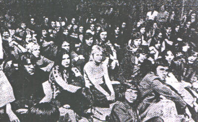 Dicht gedrängt saßen die Fans beim Konzert der bekannten Hagener Progressiv-Band "Elias Grobschnitt" im Hasper Jugendheim an der Talstraße. Die Grobschnitts brachten die Zuhörer allerdings nicht von den Stühlen, denn die hatten sich auf dem Boden des Saales breitgemacht. Grobschnitt bespielte erst kürzlich in den Hamburger Windrose-Studios eine erste Langspielplatte. |
