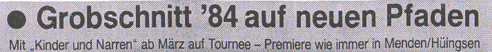 Die Segel für die Reise ins 14. Jahr sind gesetzt. Allen (deutschen) Wellen zum Trotz, sie wollen leben und leben noch. Das Auf und Ab der Szene in den letzten Jahren konnte dem Boot keinen Schaden zufügen. Auf einem Bauernhof bei Sprockhövel wird zur Zeit letzte Hand angelegt: Grobschnitt rüstet zur Konzertreise 84. Im Gepäck führen Lupo, Wildschwein, Milla, Toni, Jürgen und Peter das neue Konzept-Album "Kinder und Narren" mit. Drei Stunden wollen die Hagener ihr Publikum verzaubern, in eine bunte Fantasy-Welt entführen. Die leicht düstere Ausstrahlung von Illegal" oder "Razzia" ist verschwunden. Vielmehr möchte die Band jetzt die Ermunterung zum Ausdruck bringen, daß jeder Einzelne aus sich selbst heraus etwas an bestehenden negativen Zuständen ändern sollte. Milla Kapolke, der für den Großteil der Texte verantwortlich zeichnet: "Da eine Rockband die Chance zu einer Aussage hat, die von den Jugendlichen verarbeitet wird, möchten wir "positive Gefühle" wie beispielsweise "Liebe" einbringen." Aus drei Textvorschlägen für eine Single ist die Fantasy-Story "Kinder und Narren" gewachsen, die innerhalb von nur einer Woche "locker und ohne Streß" aufs Band gebracht und der Plattenfirma angeboten wurde. Nach dem Ausstieg von Soundtüftler und Schlagzeuger Erke mischen jetzt Siggi Bemm vom Woodhouse-Studio in Dortmund und Geheimrat Günstig, der ansonsten hinter dem Band-Mischpult hockt, die grobschnittlichen Sound-Geschicke. Überhaupt wandelt die Rock-Institution aus Hagen mit ihrem neuen Organisten Jürgen Cramer und Erke-Nachfolger Peter Jureit, der von den Dortmunder "Conditors" zur Band stieß, musikalisch auf neuen Pfaden. Nicht nur, daß sich "Wildschwein" jetzt auch als Saxophonist versucht - die Musik ist, kurz gesagt, tanzbar geworden. In Bezug auf die Bühnenshow bleibt sich Grobschnitt treu: Die Konzertbesucher können sich auf eine mit "Rockpommels Land" vergleichbare Präsentation freuen. "Das bedeutet keine Hinwendung zum Alten", betont Gitarrist Lupo, sondern entspricht einfach dem Stil der Band. Die Show, die wir diesmal bringen, wird eindeutig Grobschnitt 84 repräsentieren. Obendrein kann ich versprechen, daß wieder Melodik angesagt ist, die auf unserer letzten Langspielplatte allgemein vermißt wurde." Neben einem Abstecher nach Zürich stehen 40 deutsche Städte auf dem Tour-Plan. Am30. März fällt in der Kulturhalle Menden/Hüingsen traditionell der Startschuß. Weitere Termine in der näheren Umgebung: 13. April Düsseldorf; 14. April Essen; l6. Mai Hagen; 17. Mai Wuppertal und 19. Mai Meschede.