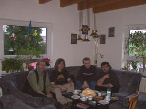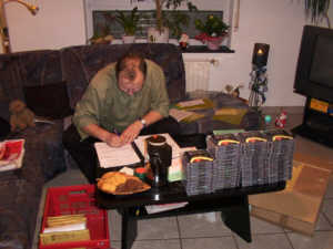 | Am 13.12.2001 war es endlich soweit. Die Lieferung der neuen DoppelCD "The History Of Solar Music Vol. 1" war bei Ralf Dreger angekommen Aufgrund der Vorweihnachtszeit hatte es Terminprobleme mit der Druckerei gegeben und die CDs erreichten ihn erst mit etwa zweiwöchiger Verspätung. EROC war am Sonntag, den 16.12.2001 nach Menden gekommen um die Signierwünsche der Vorbesteller zu erfüllen. Somit konnten die Vorbestellungen endlich bearbeitet werden. Ich hatte die Gelegenheit - auf Einladung von Ralf - an diesem Tag ebenfalls anwesend zu sein. Ralfs Frau hatte zur Stärkung einen sehr guten Kuchen gebacken. So ergab sich zunächst einmal eine lockere Gesprächsrunde, die die alten Zeiten und die neue Produktion zum Inhalt hatte. |