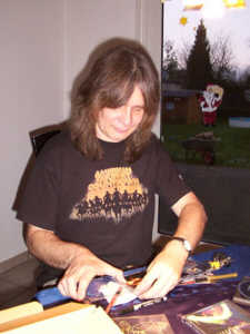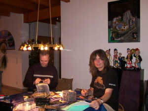 Die CD-Firma hatte ein falsches Inlay für die CDs eingebaut, statt durchsichtig war es schwarz. Nach kurzer Begutachtung waren wir alle der Meinung, dass die durchsichtige Version besser aussieht. Das hieß dann allerdings, in die Hände gespuckt und die Inlays getauscht. Während wir uns zu dritt an den Austausch machten, signierte EROC die Innenteile mit einem sehr gut zu dem Innenbild passenden, bronzefarbenen Stift. Die fertigen Stücke machte Ralf dann versandfertig. Zu unserer "vorweihnachtlichen Bastelarbeit" lief natürlich, wie sollte es auch anders sein, die neue CD. Auch ohne sich darauf konzentrieren zu können, machten die Silberlinge schon einen sehr guten Eindruck.